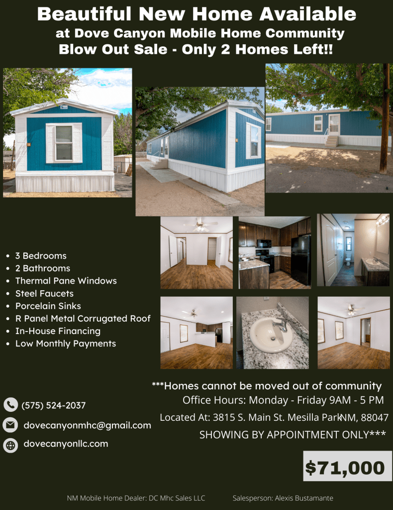 For more information, please call Dove Canyon Management, Alexis (575) 524-2037, dovecanyonmhc@gmail.com or visit us on Facebook https://www.facebook.com/DoveCanyonMobileHomeCommunity